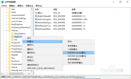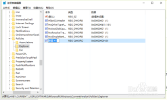 接着依次打开[HKEY_CURRENT_USER/Software/Microsoft/Windows/CurrentVersion/Policies/Explorer]