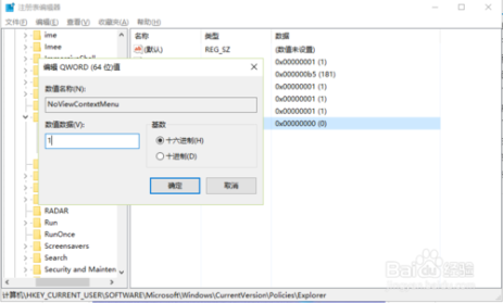 改完名后,双击“NoViewContextMenu”,打开一个“编辑DWORD值”窗口,在数据数值下,将值改为“1”,然后按确定,就修改完成了,去试一试是否可以复制粘贴了。